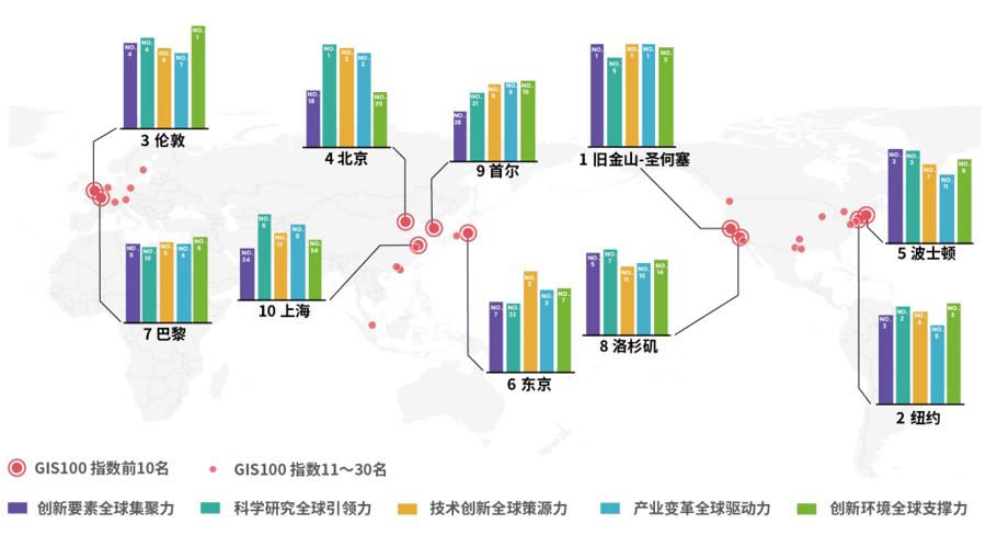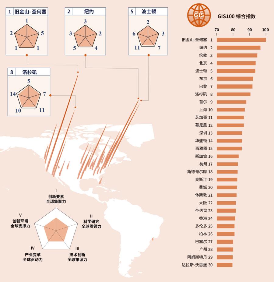 经五大维度评估,综合排名前30的全球科技创新中心依次为:旧金山-圣何塞、纽约、伦敦、北京、波士顿、东京、巴黎、洛杉矶、首尔、上海、芝加哥、慕尼黑、深圳、华盛顿、西雅图、新加坡、杭州、斯德哥尔摩、奥斯汀、费城、休斯敦、大阪、圣迭戈、香港、多伦多、柏林、巴塞尔、广州、阿姆斯特丹、达拉斯-沃思堡。