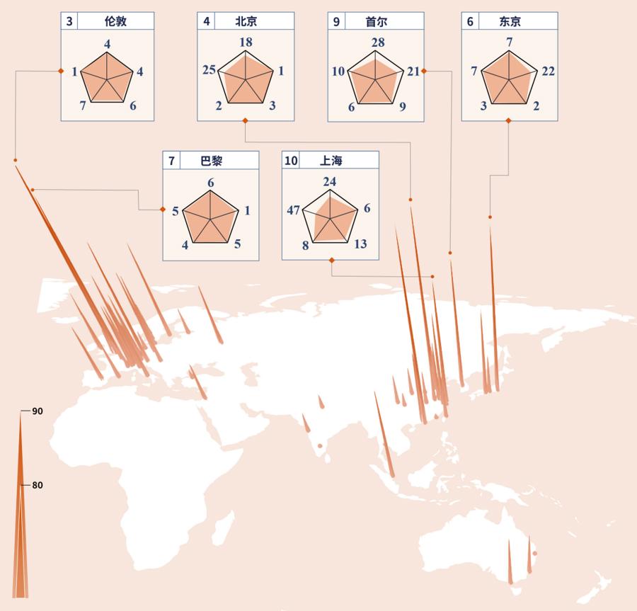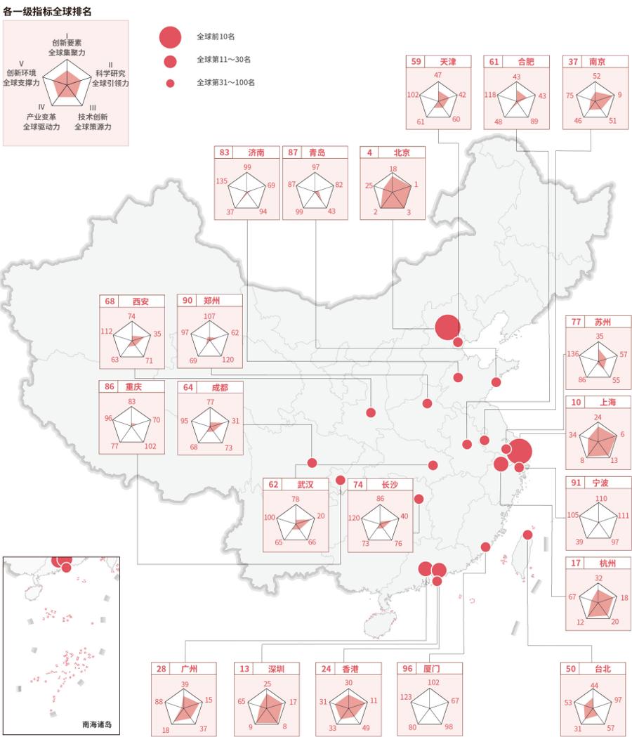 与之相比,中国有21个科技创新中心进入全球前100,且有6个科技创新中心进入前30强。京津冀城市群、长三角城市群和粤港澳大湾区三大地带,集中了11个科技创新中心。北京保持其全球第四、亚太第一的地位,同时也在“科学研究全球引领力”这一维度上引领全球发展;上海则保持其全球第十、亚太第四的位置。