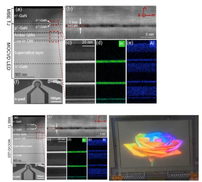 南京大学、厦门大学、合肥工业大学和沙特阿卜杜拉国王科技大学联合攻关氮化镓基高铟组分红光材料及其Micro-LED器件技术,采用分子束外延制备出高电注入效率的隧道结红光Micro-LED器件。相关成果发表在《Applied Physics Letters》上,并选为Editor’s Pick。进一步与天马微电子公司合作,研制出国际上第一块基于铟镓氮基红绿蓝Micro-LED芯片的1.63寸、像素密度达403 PPI的TFT驱动全彩显示屏,完成了Micro-LED全彩显示方案的新技术验证。