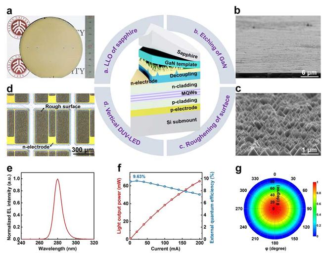 针对深紫外LED电光转换效率低下的难题,北京大学团队提出了一种基于GaN/蓝宝石模板的深紫外LED制备新技术路线,通过高Al组分AlGaN层预置裂纹,实现器件结构层与GaN层的应力解耦,得到表面无裂纹的深紫外LED晶圆,同时预置裂纹可有效缓冲剥离过程中的局部应力。该技术路线充分利用了Ga金属滴在激光剥离过程中为液态的优点,采用常规的355 nm短波长激光器实现了深紫外LED外延结构2-4英寸晶圆级无损伤剥离,并成功制备出垂直注入器件,200 mA注入电流下,发光波长280 nm的深紫外LED光输出功率达65.2mW。相关成果发表于《Nature Communications》上。