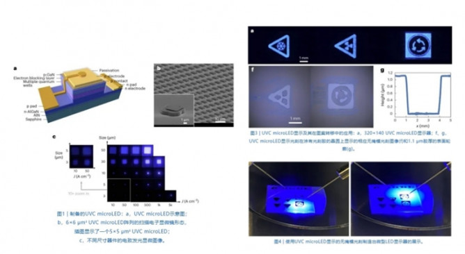 香港科技大学、南方科技大学、国家第三代半导体技术创新中心(苏州)、思坦科技等单位通过长期联合攻关,基于高功率密度、高像素密度、低功耗的深紫外Micro-LED显示芯片实现了深紫外Micro-LED无掩膜光刻技术,搭建了无掩膜光刻原型机平台并制备首个深紫外Micro-LED无掩膜曝光的Micro-LED器件,将紫外光源和掩膜板图案融为一体,在短时间内为光刻胶曝光提供足够的辐照剂量,为产业发展开创了一条新路径,相关成果发表在《Nature Photonics》。