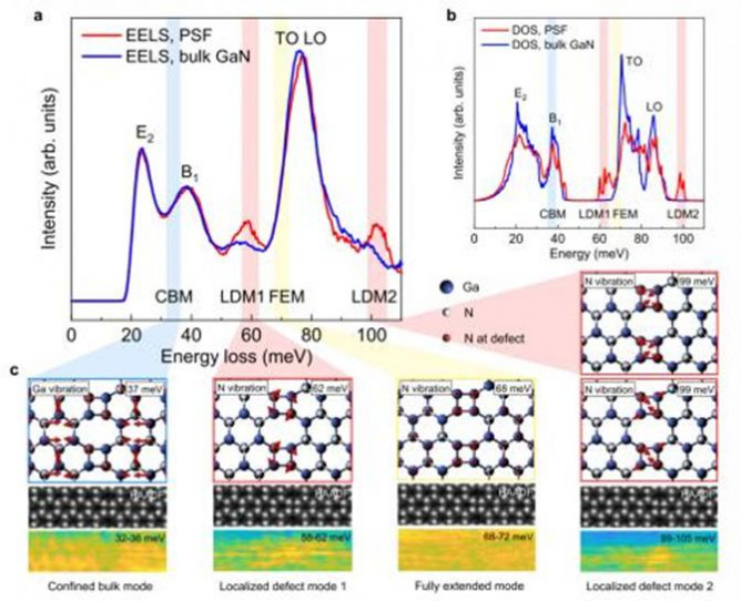 针对氮化物半导体中与缺陷相关的局域振动模难以分析表征的问题,北京大学团队与美国橡树岭国家实验室合作,使用扫描透射电子显微镜-电子能量损失谱技术,结合高角环形暗场成像及EELS谱与第一性原理计算,精确识别了氮化镓中层错缺陷的原子结构,并观测到相关的三种声子振动模式:局域缺陷模式、受限体模式和完全扩展模式。相关研究实现了氮化物半导体中缺陷相关的声子模式分辨,并为氮化物半导体器件的热管理技术发展提供了新的思路。相关成果发表在《Nature Communications》上。